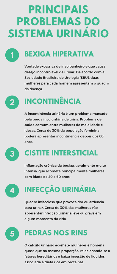 Entre os principais problemas que afetam o sistema urinário, estão quadros de bexiga hiperativa, incontinência urinária, cistite intersticial, infecção urinária e pedras nos rins. Confira mais no quadro abaixo sobre cada caso e como eles podem afetar, principalmente, as mulheres.