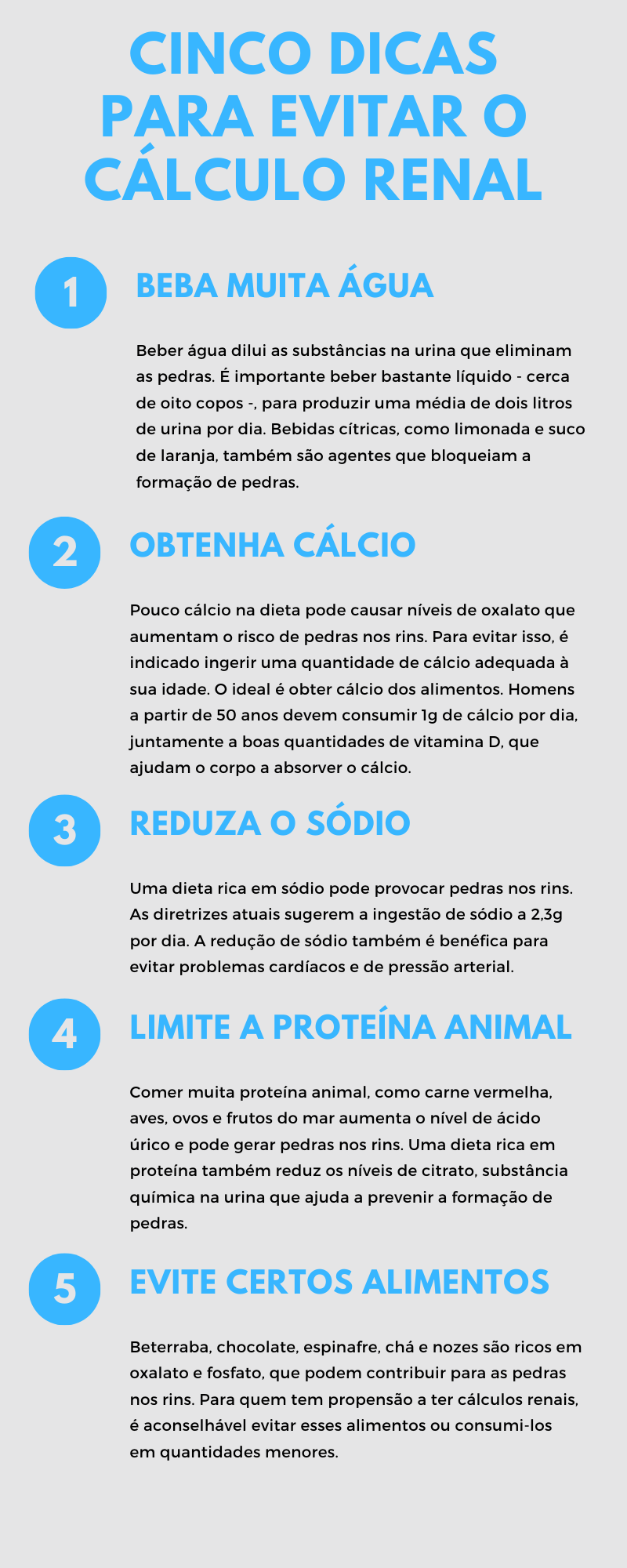 A cólica renal surge da obstrução do ureter (canal que drena a urina do rim para a bexiga) por um cálculo. Se ele for pequeno, de até um centímetro, é possível aguardar de uma semana a dez dias pela eliminação espontânea por meio da urina. Se o cálculo for maior e o quadro estiver associado a infecção urinária ou dor que não passa mesmo com remédios, há a necessidade de procedimento cirúrgico para a sua retirada.